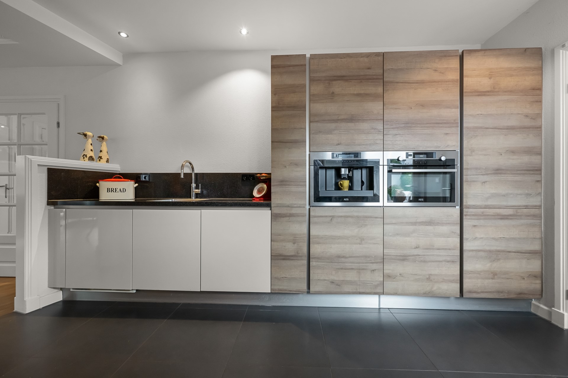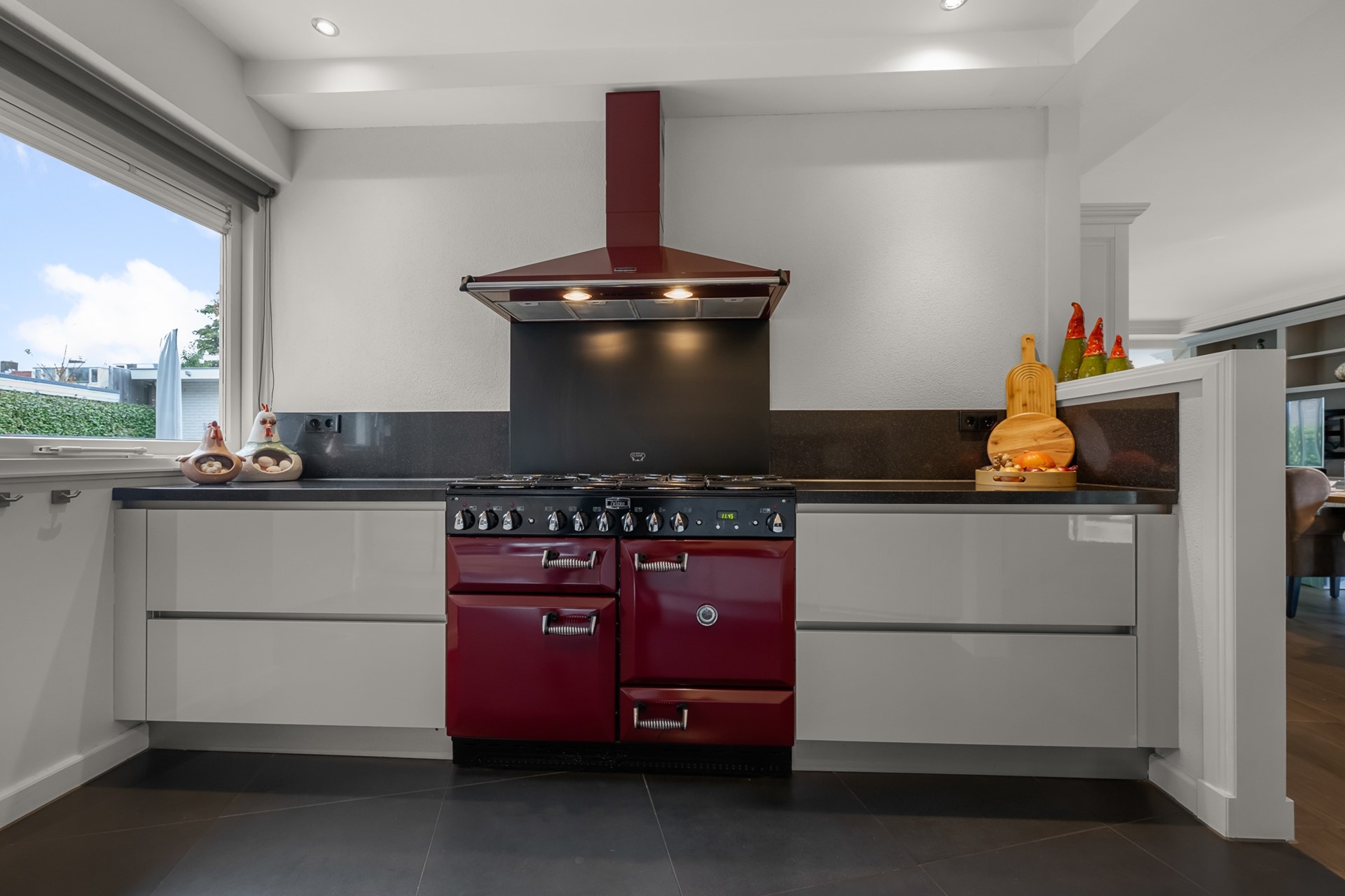 De keuken is compleet uitgevoerd en is voorzien van een koelkast en separate vriezer, combi-magnetron, vaatwasser, ingebouwd koffieapparaat, Quooker én een karakteristiek Falcon fornuis. Hiermee is er alle ruimte en comfort voor kookliefhebbers. Direct naast de keuken bevindt zich de bijkeuken met extra opbergruimte en aansluiting voor wasmachine en droger. Vanuit hier is ook de eerste, inpandige garage toegankelijk — ideaal voor opslag, hobby’s of het parkeren van een auto.