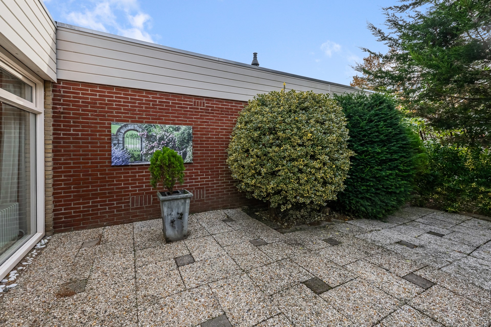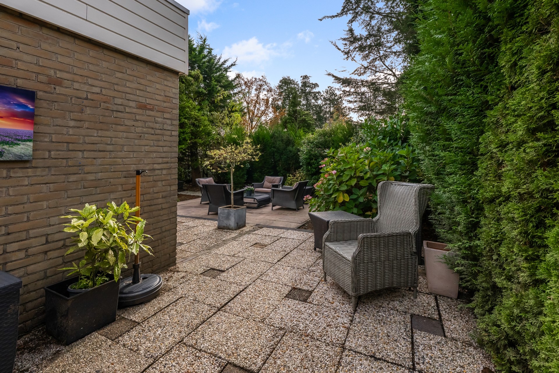 • Tuin met tegels en veel beplanting