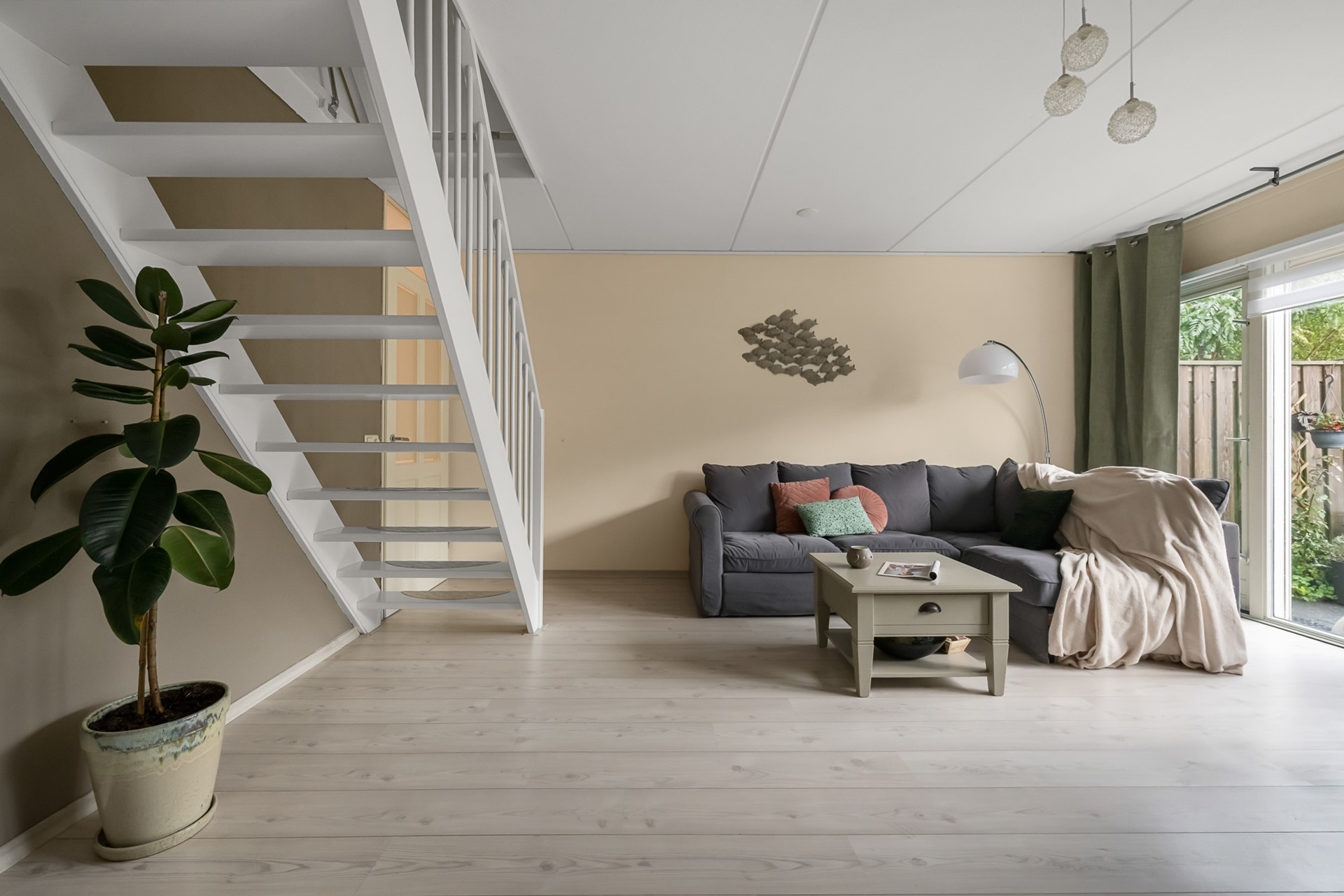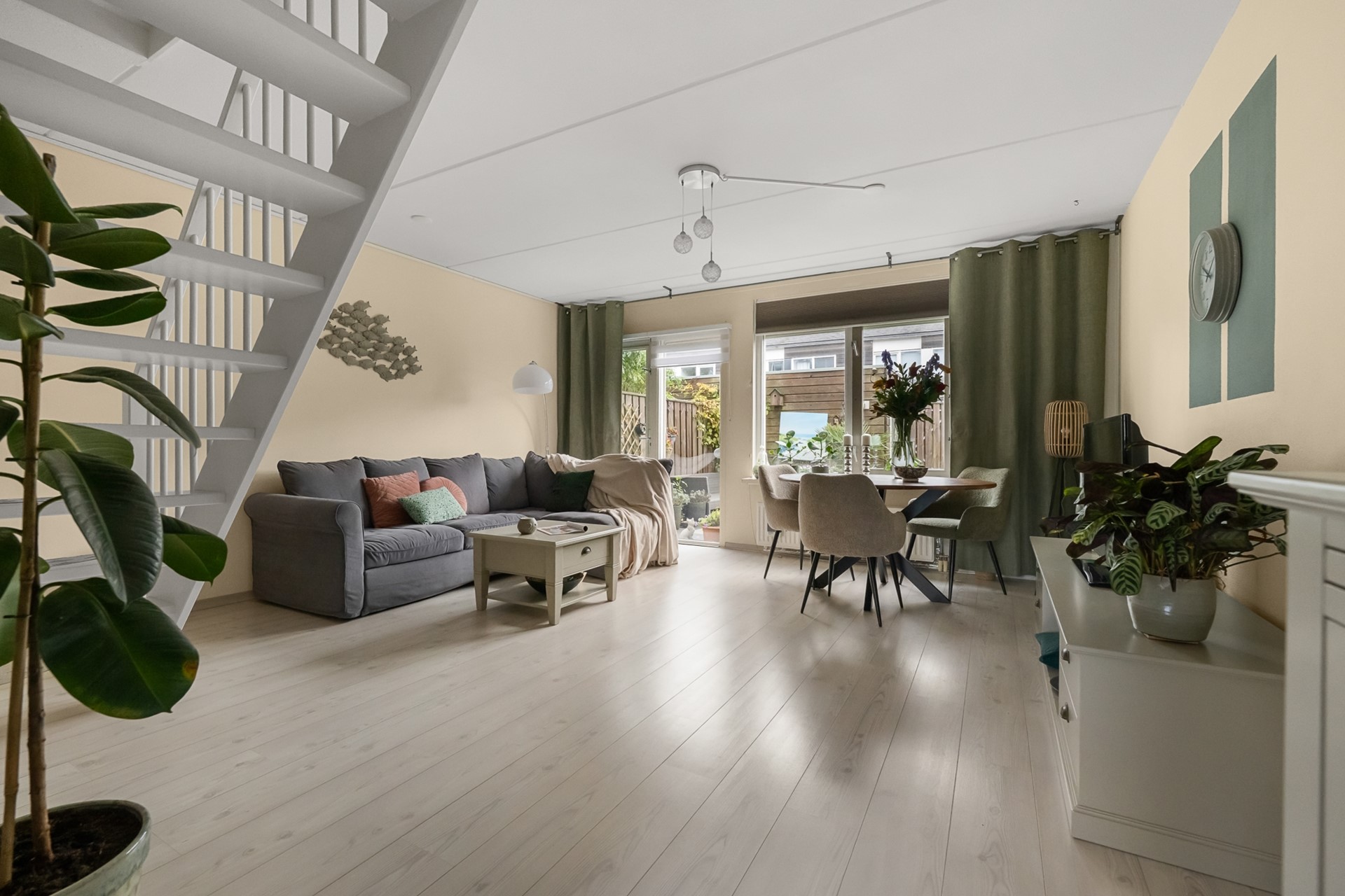 Via de entree met hal, meterkast, garderobe en het in 2024 vernieuwde toilet kom je binnen in de sfeervolle woonkamer. Dankzij de grote raampartijen is de woonkamer heerlijk licht en biedt deze direct toegang tot de zonnige achtertuin. De achterramen zijn voorzien van screens als zonwering, wat zorgt voor extra comfort tijdens warme zomerdagen.