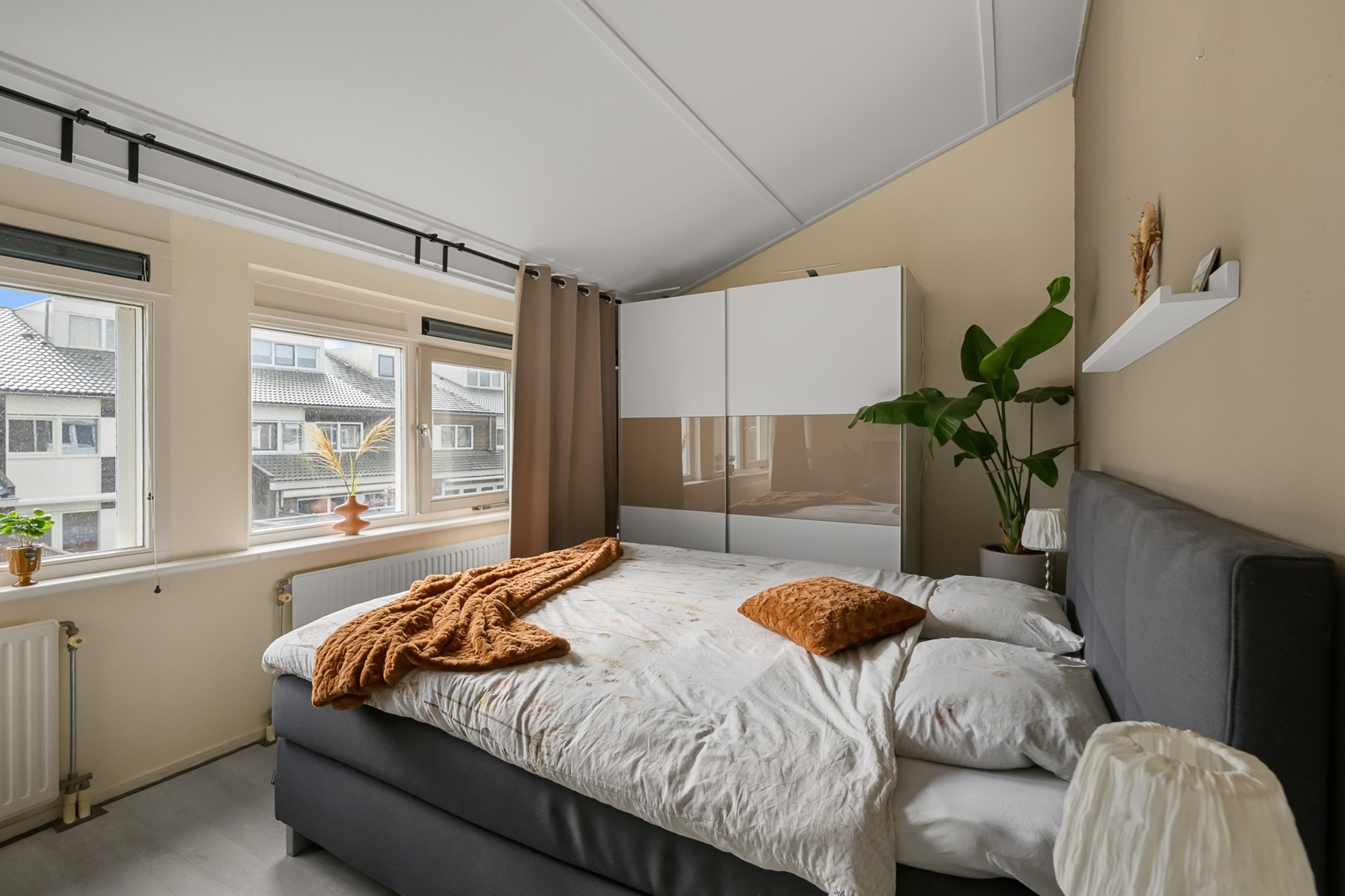 De master bedroom aan de achterzijde is een echte blikvanger. Dankzij de rolluiken geniet je van volledige privacy en een comfortabele nachtrust. Het speels oplopende plafond geeft de kamer een unieke uitstraling en een gevoel van ruimte en luchtigheid. Hier is volop plek voor een groot bed en kledingkasten.
