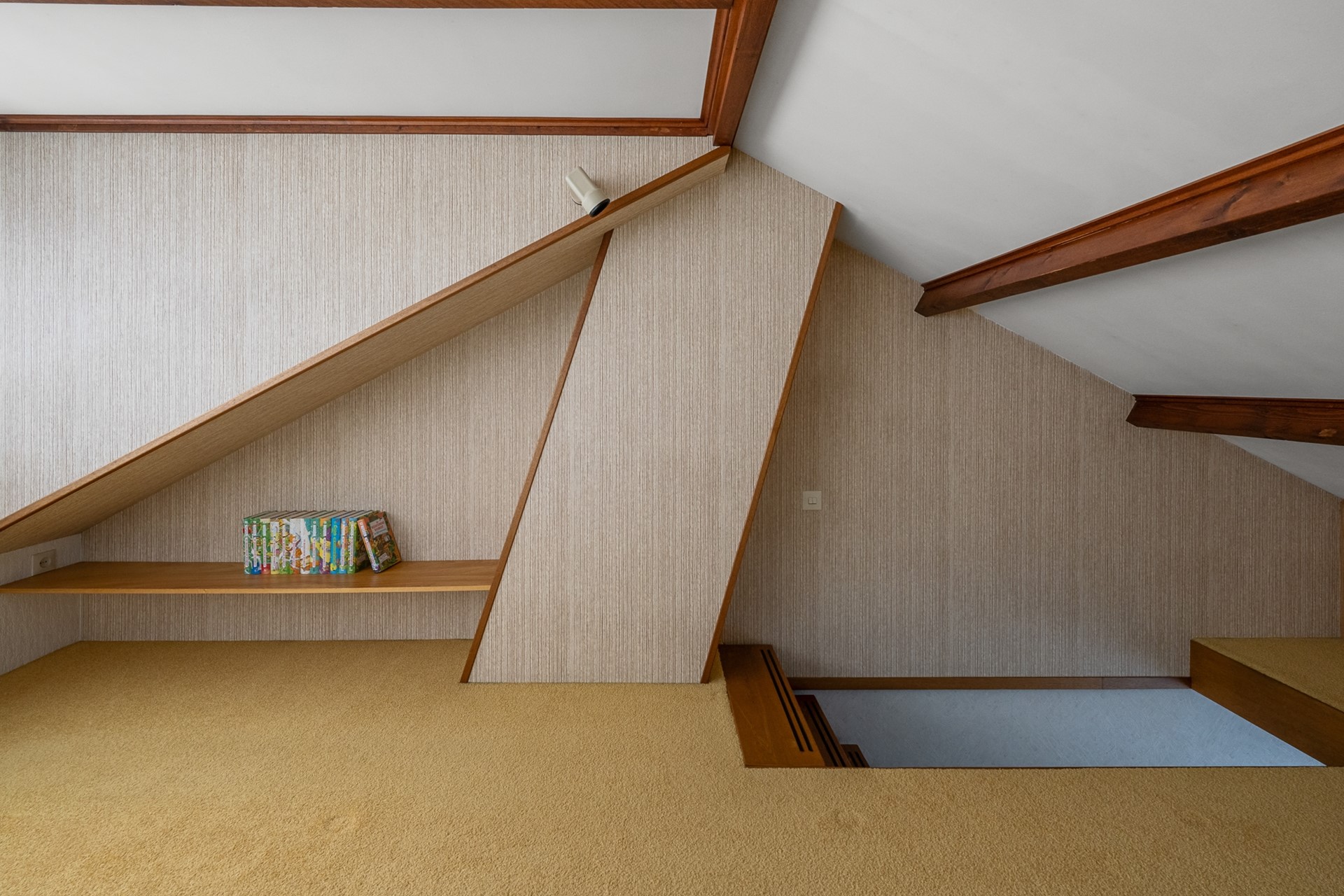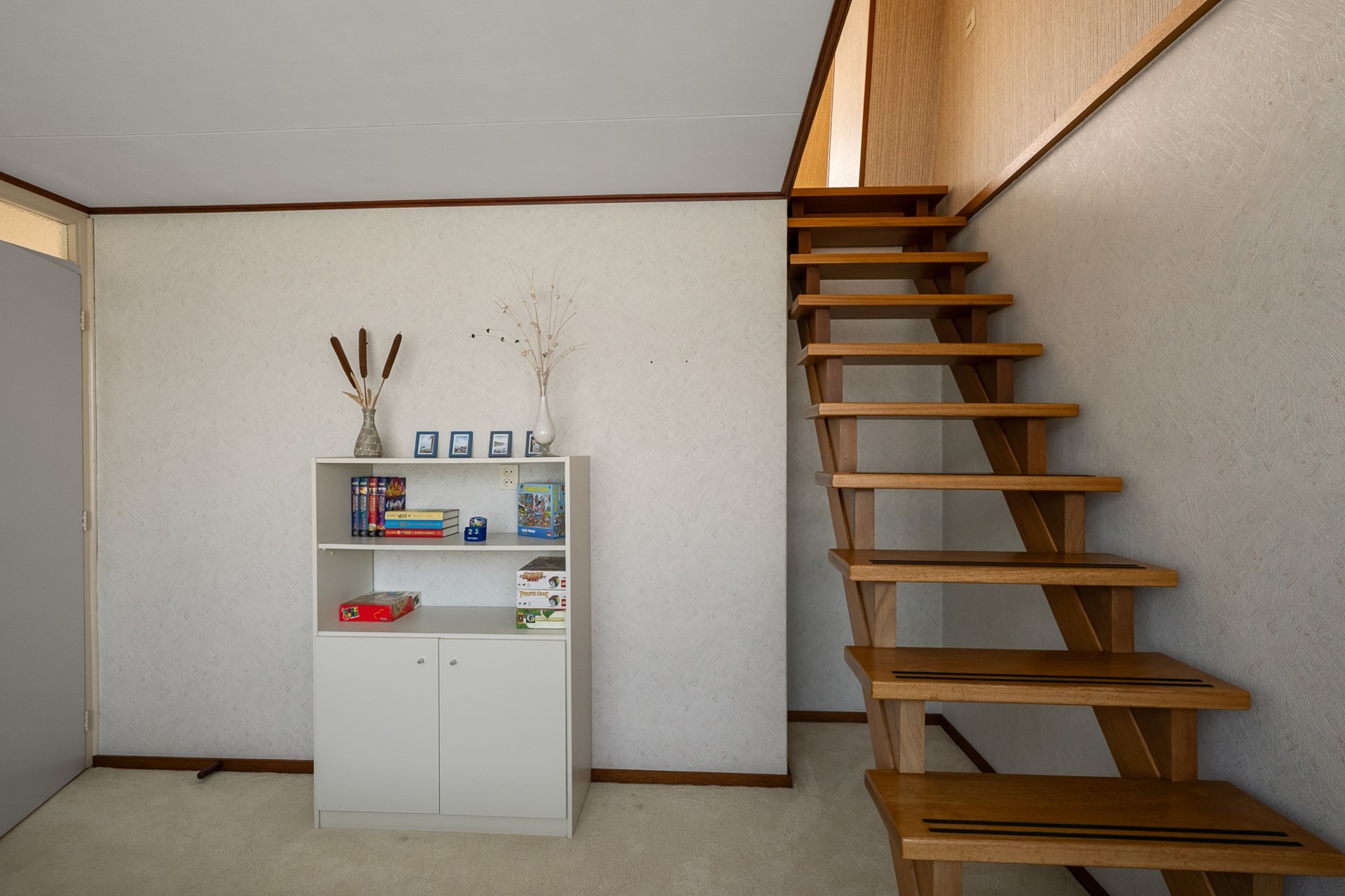 Overloop met toegang tot drie slaapkamers en een compacte badkamer. Eén van de slaapkamers beschikt over een trap naar de tweede verdieping.